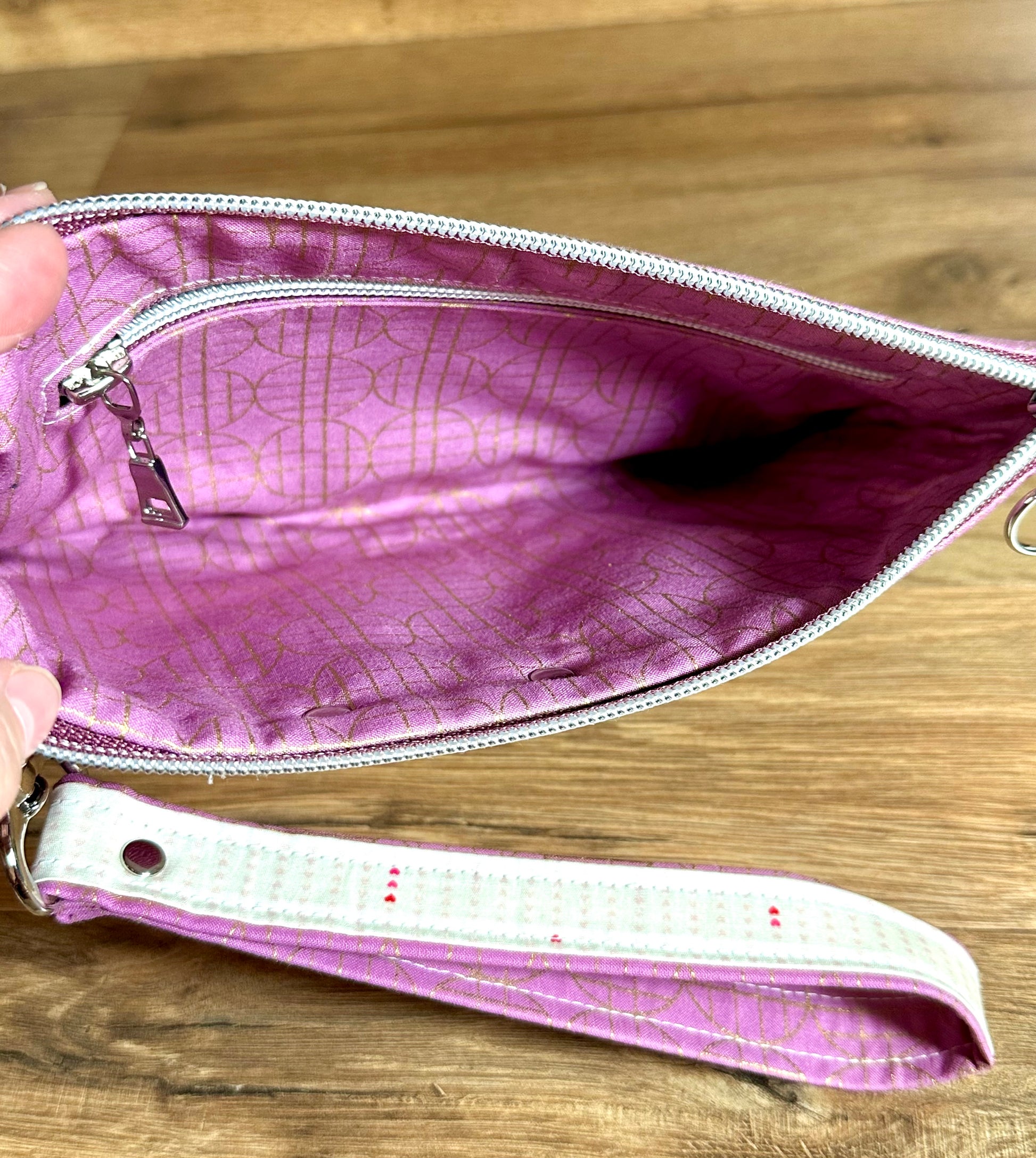 This elegant piece also comes with a wristlet strap for effortless carrying.